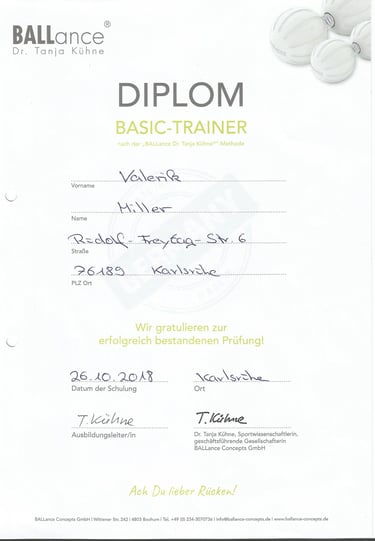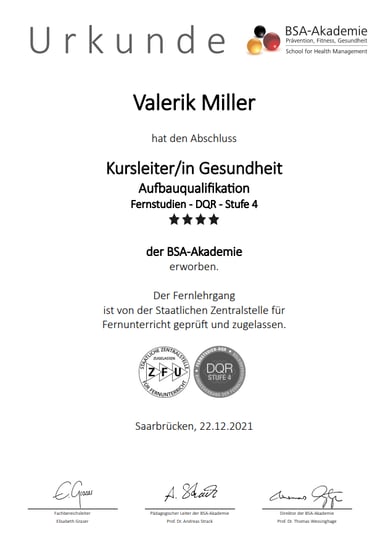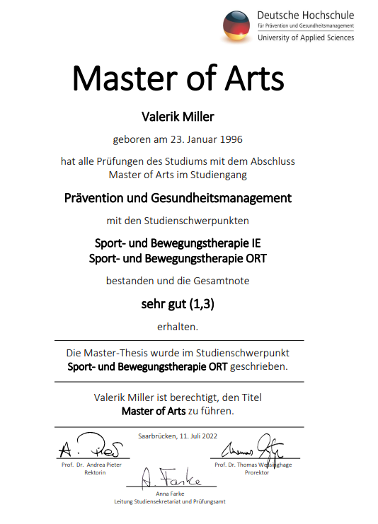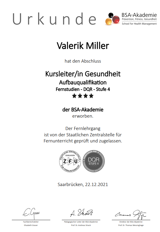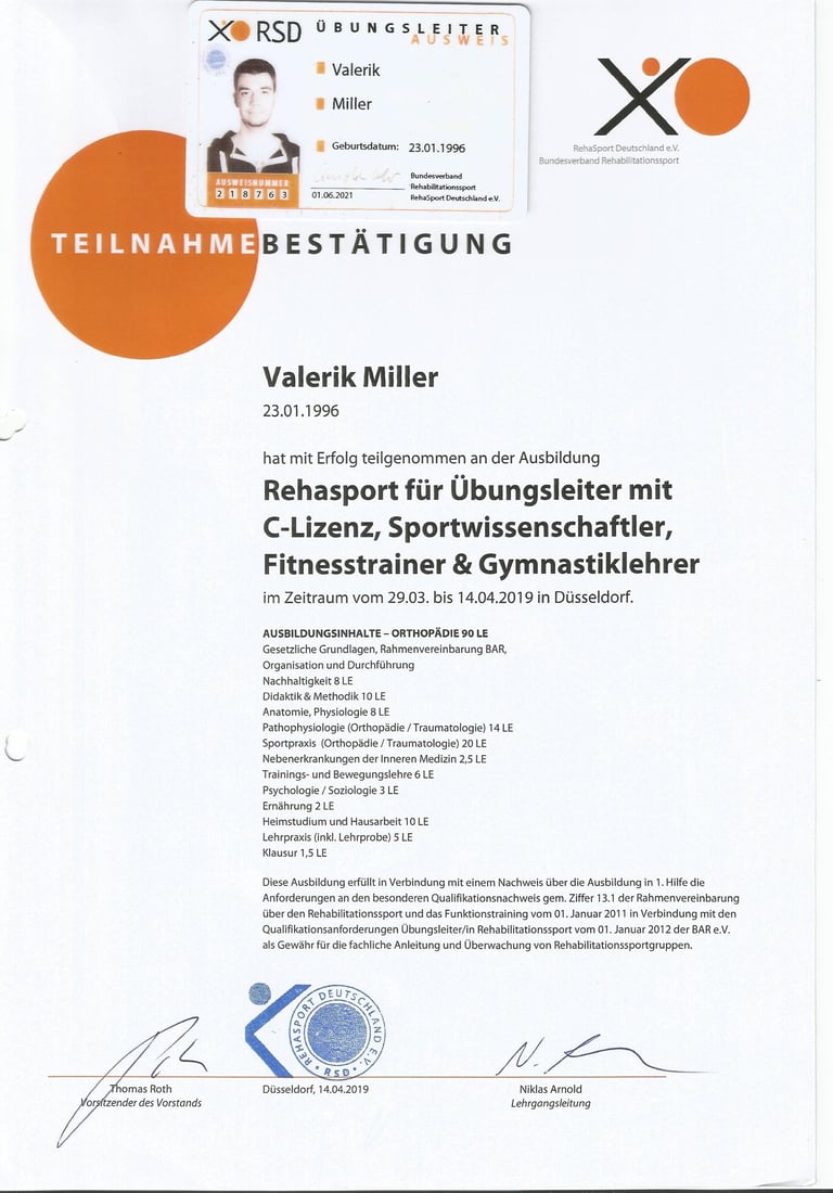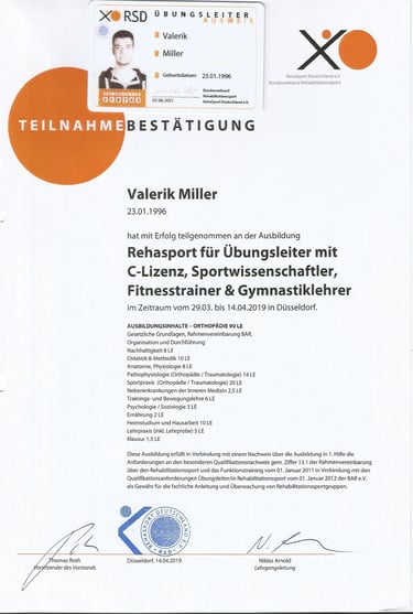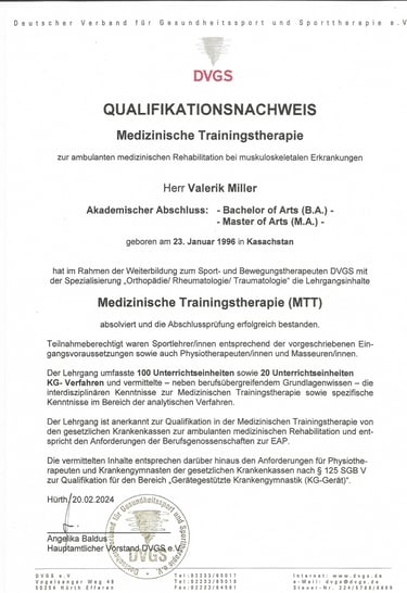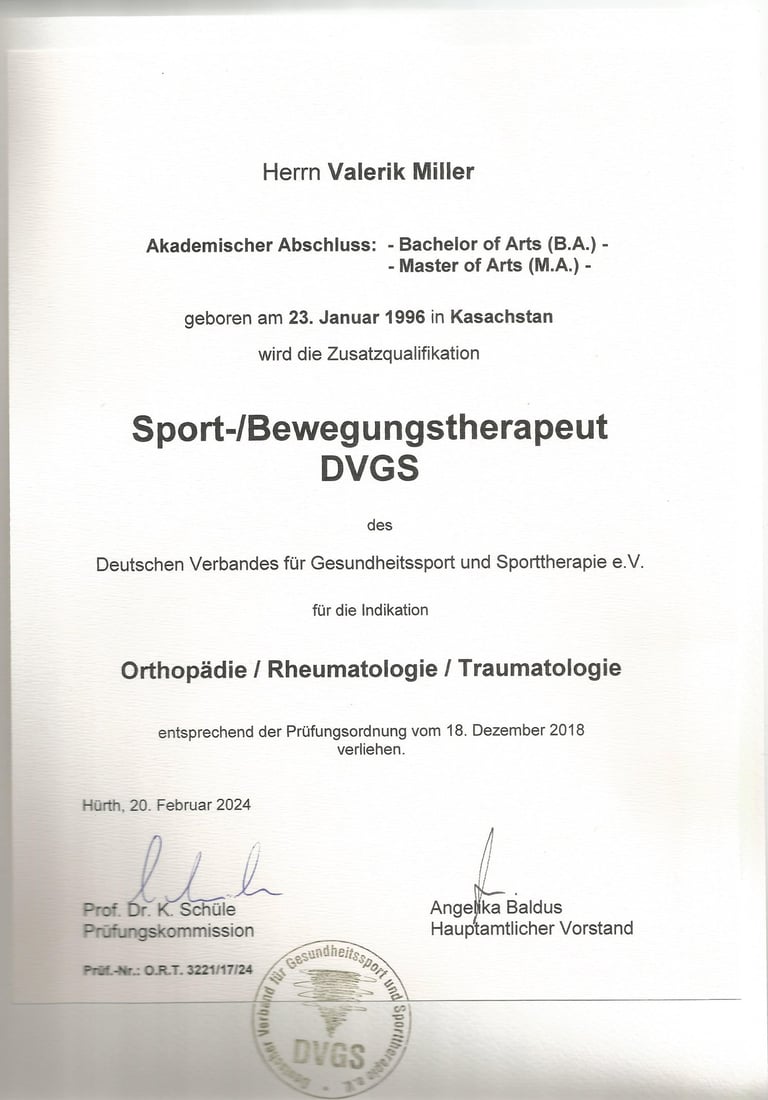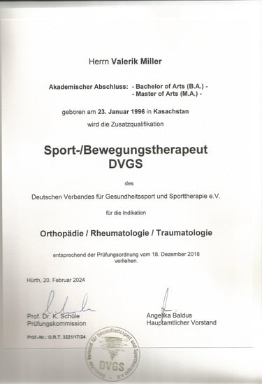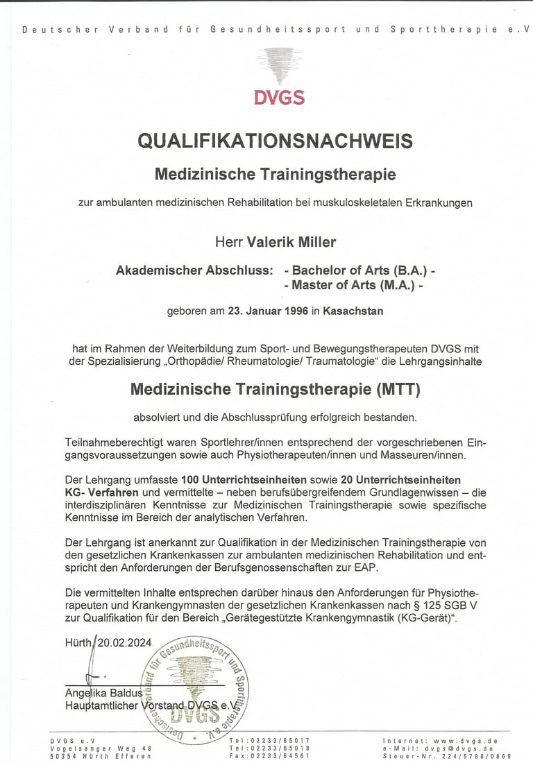 - Sport- und Bewegungstherapie Zusatzqualifikationen in den Bereichen: Kardiologie, Gefäßerkrankungen, Diabetes Mellitus, Adipositas, Atemwegserkrankungen, Rückenschule, Osteoporose, Sturzprävention, Sporttherapie in der Geriatrie, Medical Nordic Walking, Entspannungsverfahren